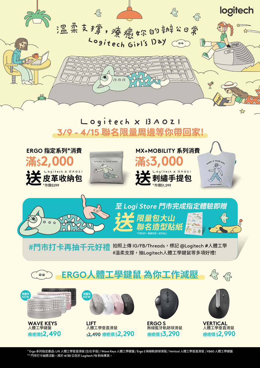 門市現場拍照打卡上傳 IG/FB,並標記 @Logitech #人體工學 #溫柔支撐,再抽Logitech人體工學鍵鼠等多項好禮!